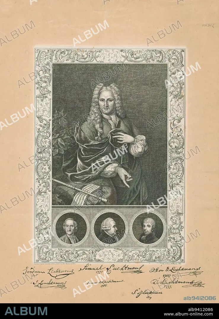 Caption: Portrait of Samuel Luchtmans, Portrait of Samuel Luchtmans, bookseller and book printer in Leiden. Next to him on the table is a recorder on open sheet music. In an ornamental frame with the portraits of Samuel II, Johannes and Samuel III Luchtmans at the bottom. Below the portrait signatures of members of the Luchtmans family. Numbered top right: 1856 Taf. I., print maker: Peter Deckers, (mentioned on object), after painting by: Hieronymus van der Mij, after painting by: Hendrik van Velthoven, Cologne, 1856, Material, lithographic engraving, height 447 mm × width 299 mm