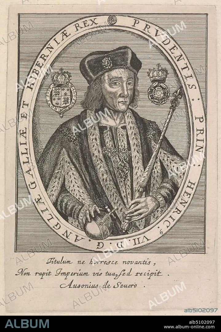 Henry VII, William Marshall, fl. 16171649, after Renold Elstrack, 15701625(?), British, after 1618, Line engraving on medium, slightly textured, cream laid paper, Sheet: 8 7/8 x 5 7/8 inches (22.5 x 14.9 cm), Plate: 6 3/4 x 4 11/16 inches (17.2 x 11.9 cm), and Image: 5 1/4 x 4 3/16 inches (13.3 x 10.7 cm), cap, cartouche, coat of arms, costume, crest, ermine, flower (plant), fur, illustration, jewels, king (person), livery collar, man, orb, oval, portrait, robe, royalty, scepter