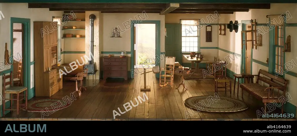 Dollhouse, Shaker Living Room, c. 1800 with stove and furniture. Interior: 9 × 21 3/4 × 24 5/8 in.