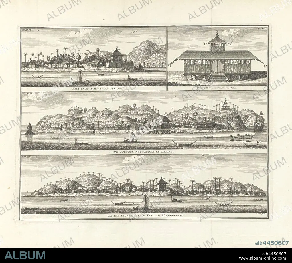 Caption: Three fortresses on Ambon Hila, and Fortres Amsterdam / New Moorish Temple of Hila / De Fortres Rotterdam on Larike / De Pas Baguwala and the Fortress Middelburg (title on object), Sheet with three coastal views fortresses of the VOC and an image of a temple on the island of Ambon. The images are numbered from XXVI to XXIX. These are: Fort Amsterdam and a temple in Hila on Ambon, Fort Rotterdam in Larike on Ambon and the Middelburg Fortress. Illustration from: Description of Amboina (1724), island, Ambon, Fort Amsterdam, Fort Rotterdam, Fort Middelburg, Dutch East India Company, Frederik Ottens (mentioned on object), Netherlands, 1722 - 1724, paper, etching, h 304 mm × w 390 mm