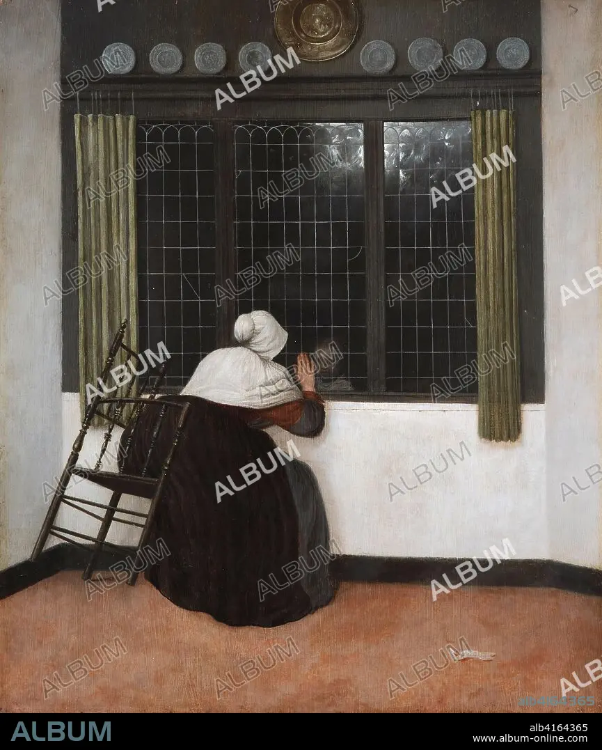 JACOBUS VREL. Woman at the window making a sign to a little girl. Second half of 17th century. Oil on panel. 45,7 x 39x2 cm.