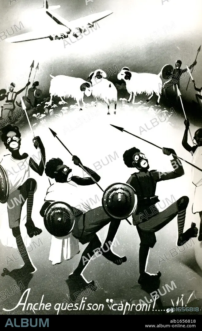 Caption: Abyssinia (Ethiopia) under attack by Italy. An Italian bomber approaching herdsmen and their goats. On 9 May 1936 Mussolini was able to announce that Italy had an empire. Italian propaganda postcard