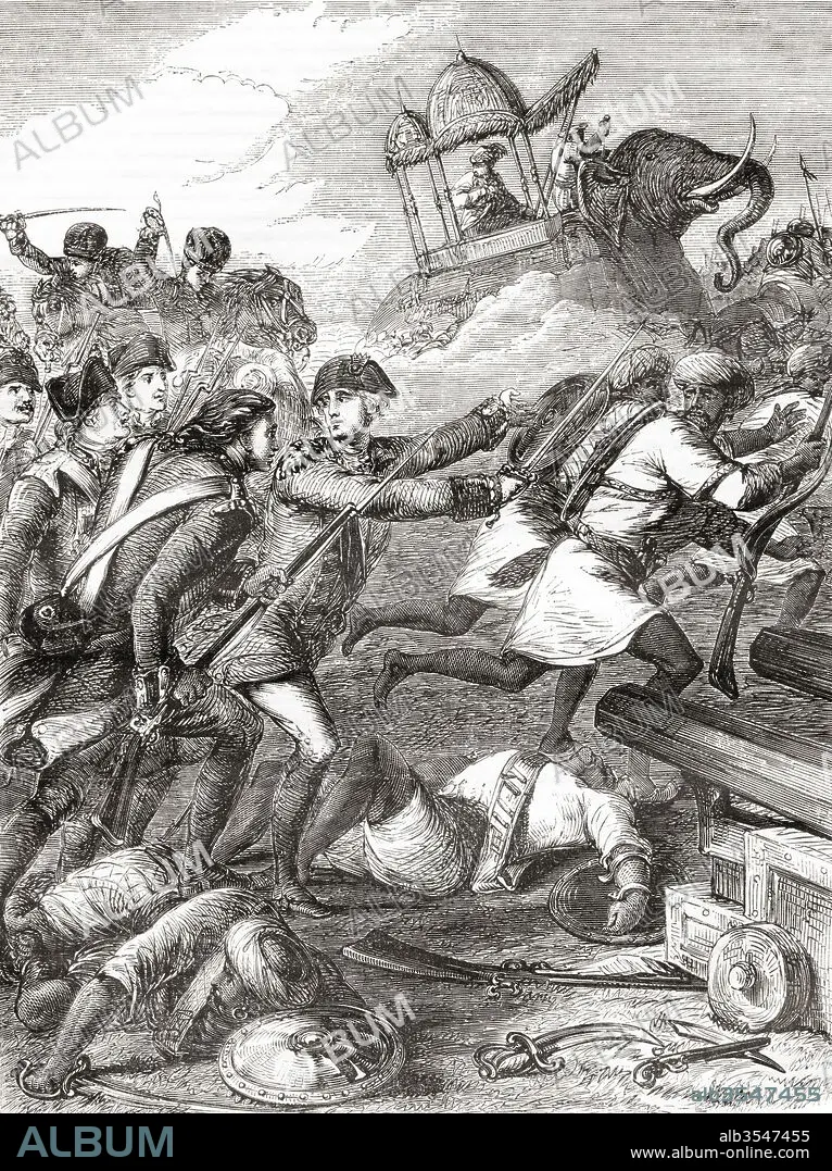 Caption: The defeat of Hyder Ali by Sir Eyre Coote during The Second Anglo–Mysore War in 1781. Lieutenant-General Sir Eyre Coote, 1726 – 1783. British soldier. Hyder Ali Khan aka Hyder Ali Sahib, c. 1720 – 1782. Sultan and de facto ruler of the Kingdom of Mysore in southern India. From Cassell's Illustrated History of England, published 1861.