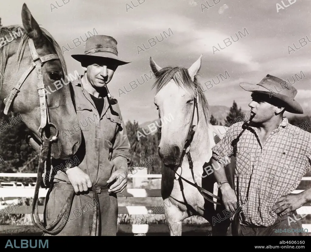 Caption: New Zealand, Station Owner and the Station Foreman, Glenrock Station, Rakaia Valley, South IslandCharles Ensor, station owner and the station foreman, stand with their horses, smoking pipes.Caption reads CHARLES ENSOR AND THE STATION FOREMAN, 1966. 2005/010/1/16/47.