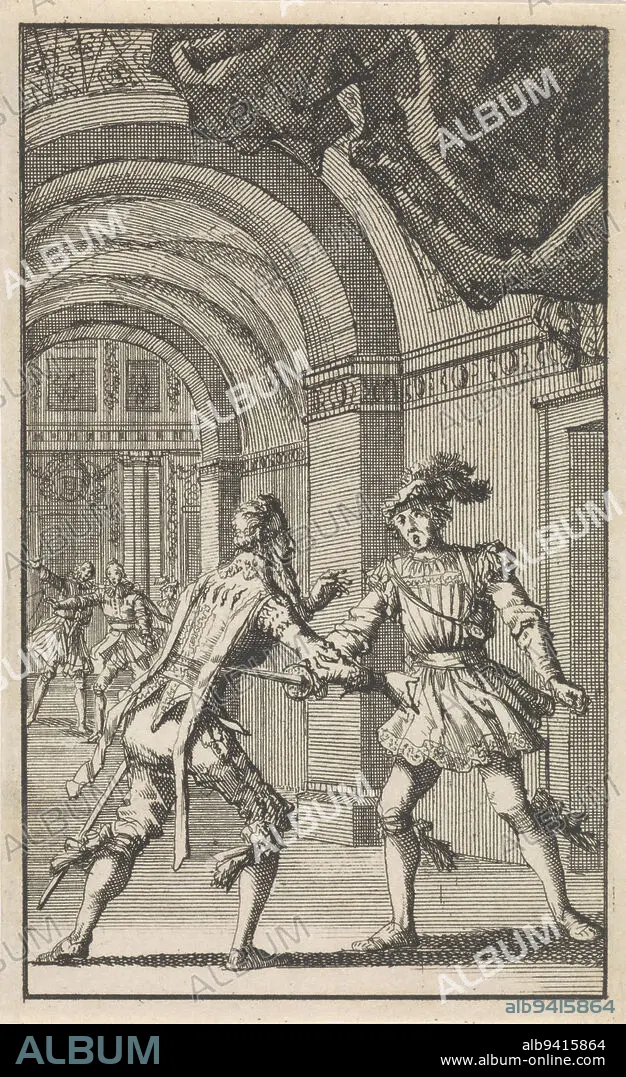 Caption: Don Carlos, the crown prince of Spain and son of Philip II, tries to kill the Duke of Alva with a dagger, Don Carlos tries to kill the Duke of Alva, print maker: Jan Luyken, Amsterdam, 1699, paper, etching, h 135 mm × w 84 mm