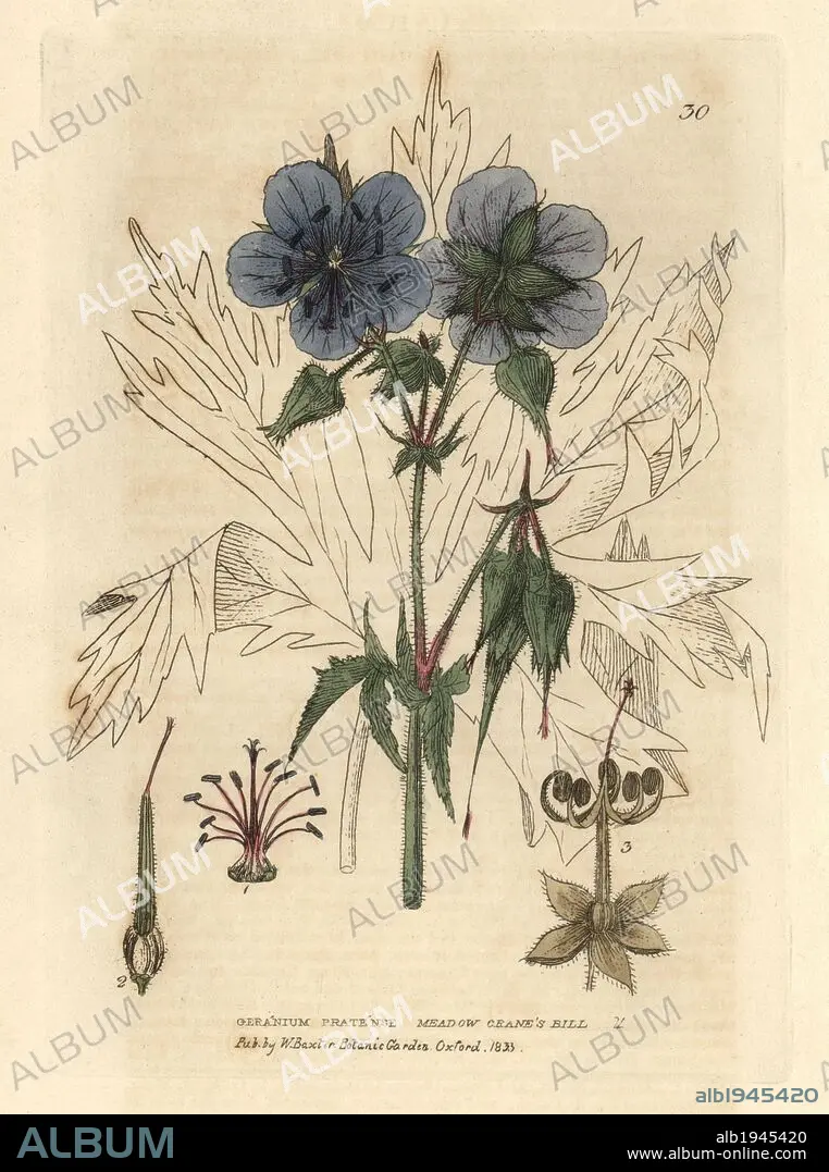 Caption: Meadow crane's bill or cranesbill, Geranium pratense. Handcoloured copperplate engraving from a drawing by Isaac Russell from William Baxter's "British Phaenogamous Botany" 1834. Scotsman William Baxter (1788-1871) was the curator of the Oxford Botanic Garden from 1813 to 1854.