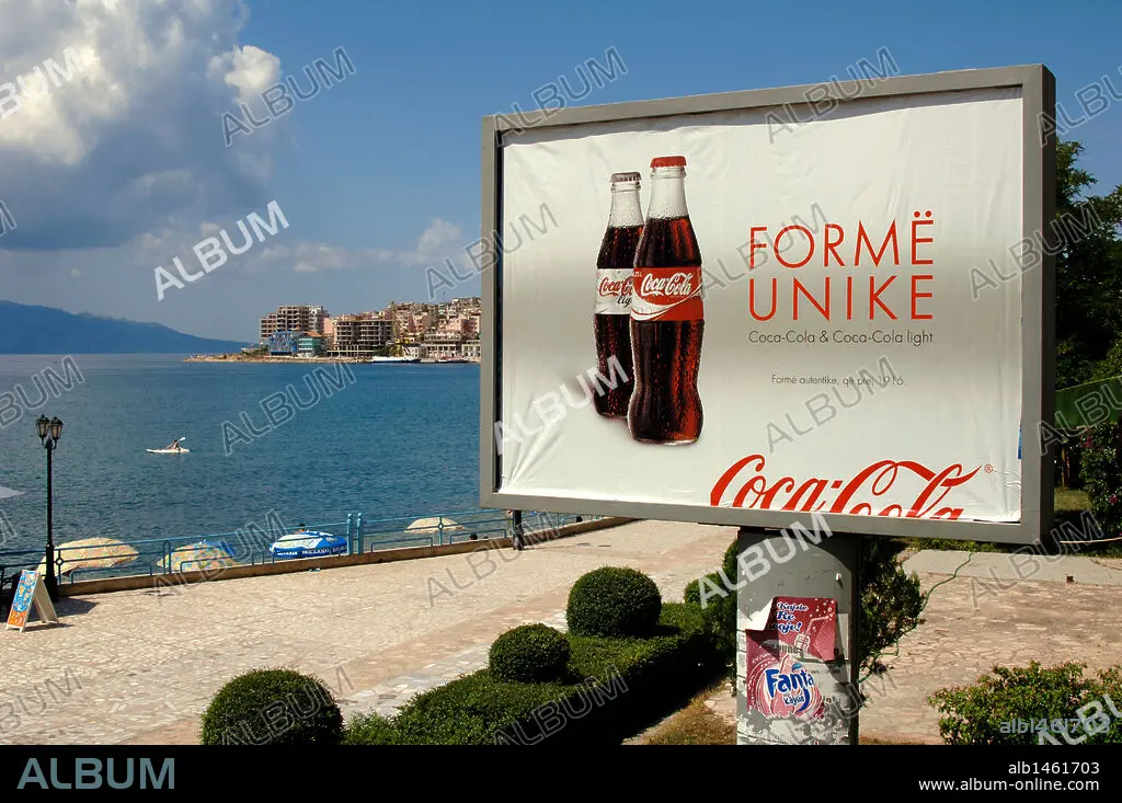 Coca-Cola advertisement on the beach of Saranda. Republic of Albania.