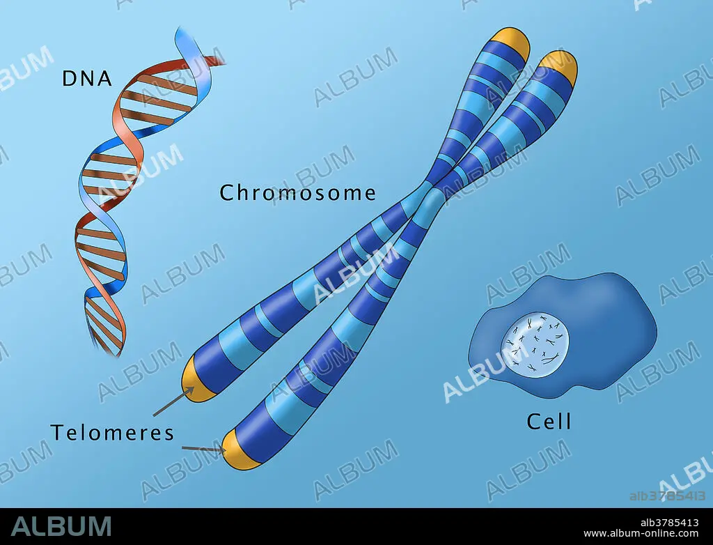 Caption: Illustration of the structure of a chromosome and its location in the cell nucleus. Chromosomes are composed of DNA (deoxyribonucleic acid) in the shape of a double helix. At the ends of chromosomes are telomeres that protect the genetic material and play a role in cell aging.