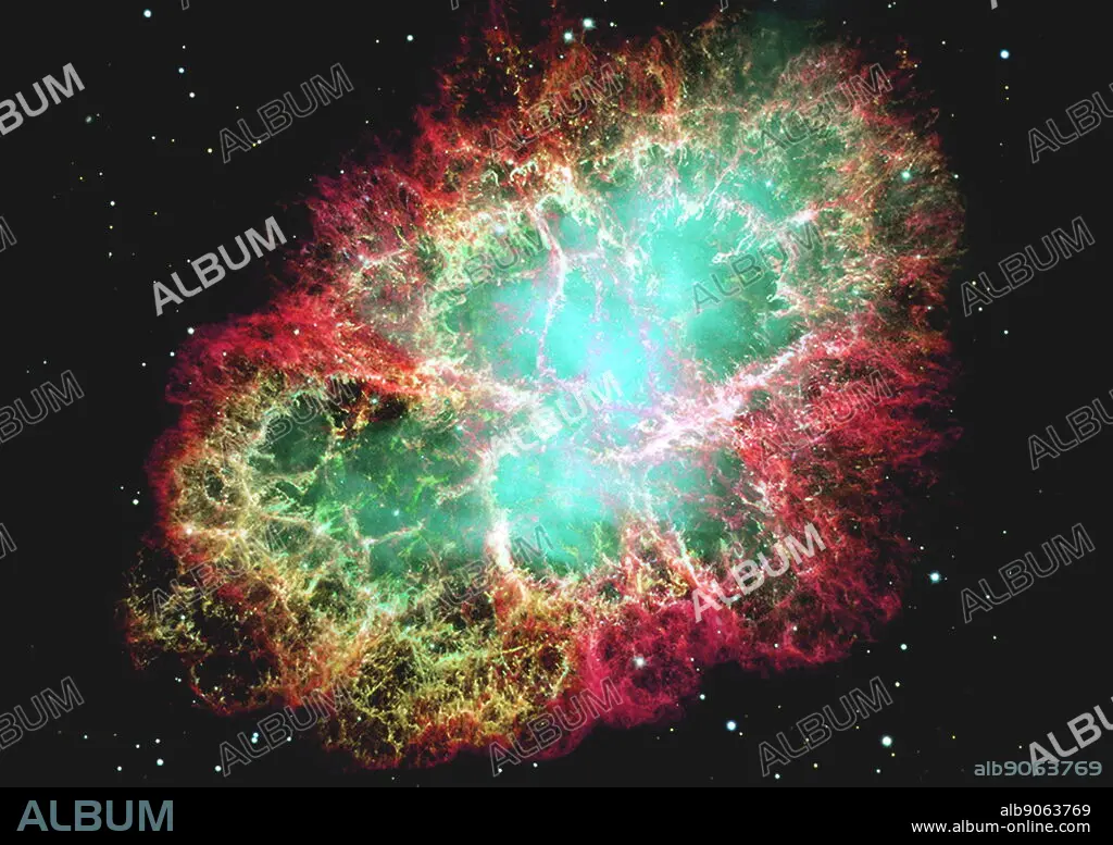 Caption: mosaic image, one of the largest ever taken by NASA's Hubble Space Telescope of the Crab Nebula, a six-light-year-wide expanding remnant of a star's supernova explosion. Japanese and Chinese astronomers recorded this violent event nearly 1,000 years ago in 1054, as did, almost certainly, Native Americans. The orange filaments are the tattered remains of the star and consist mostly of hydrogen. The rapidly spinning neutron star embedded in the centre of the nebula is the dynamo powering the nebula's eerie interior bluish glow. The blue light comes from electrons whirling at nearly the speed of light around magnetic field lines from the neutron star. The neutron star, like a lighthouse, ejects twin beams of radiation that appear to pulse 30 times a second due to the neutron star's rotation. A neutron star is the crushed ultra-dense core of the exploded star. The Crab Nebula derived its name from its appearance in a drawing made by Irish astronomer Lord Rosse in 1844, using a 36-inch telescope. taken in October 1999, January 2000, and December 2000. The colours in the image indicate the different elements that were expelled during the explosion. Blue in the filaments in the outer part of the nebula represents neutral oxygen, green is singly-ionized sulphur, and red indicates doubly-ionized oxygen.