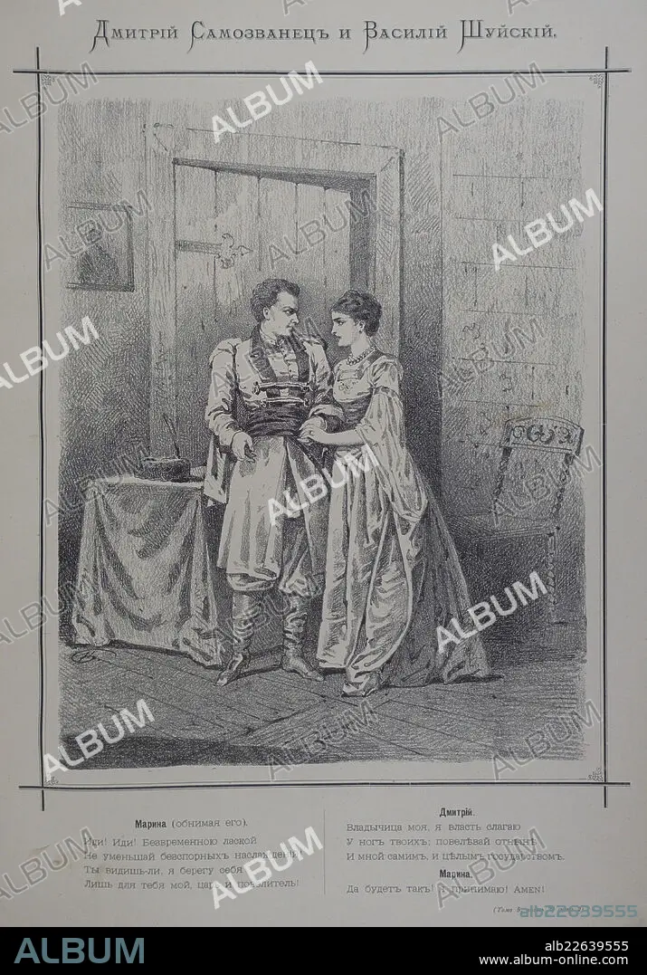 Caption: Dmitry the Pretender and Vasily Shuisky. Illustrations for plays by Alexander Nikolaevich Ostrovsky (1823-1886). St. Petersburg: Herman Kornfeld, 1881. Prize of the magazine "Strekoza". Album of drawings "Dark Kingdom". Artists N.A. Bogdanov, A.I. Lebedev, M.N. Malyshev, V.I. Porfiryev, V.S. Shpak.