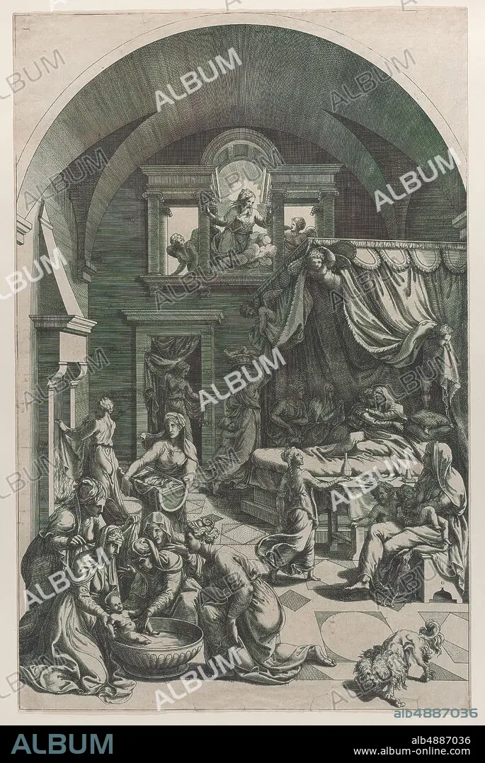 Caption: Diana Scultori, Birth of Saint John the Baptist, Diana Scultori (Italian, Mantua ca. 1535?after 1588 Rome), After Giulio Romano (Italian, Rome 1499?1546 Mantua), 155588, Engraving, Sheet (Trimmed): 18 7/16 × 11 7/8 in. (46.8 × 30.2 cm), Prints