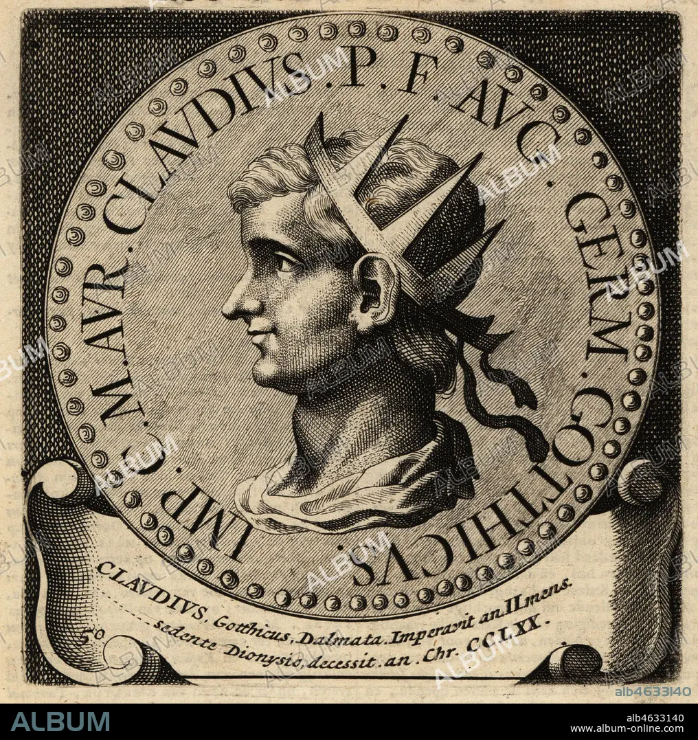 Caption: Roman Emperor Claudius Gothicus, 214-270. Marcus Aurelius Valerius Claudius Augustus also known as Claudius II, Roman emperor from 268 to 270. Copperplate engraving from Abraham Bogaerts De Roomsche Monarchy, The Roman Monarchy, Francois Salma, Utrecht, 1697.