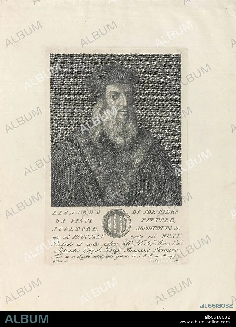 FRANCESCO ALLEGRINI. PORTRAIT OF LEONARDO DA VINCI - PAINTED IN THE 17TH CENTURY AND ENGRAVED IN THE 18TH CENTURY