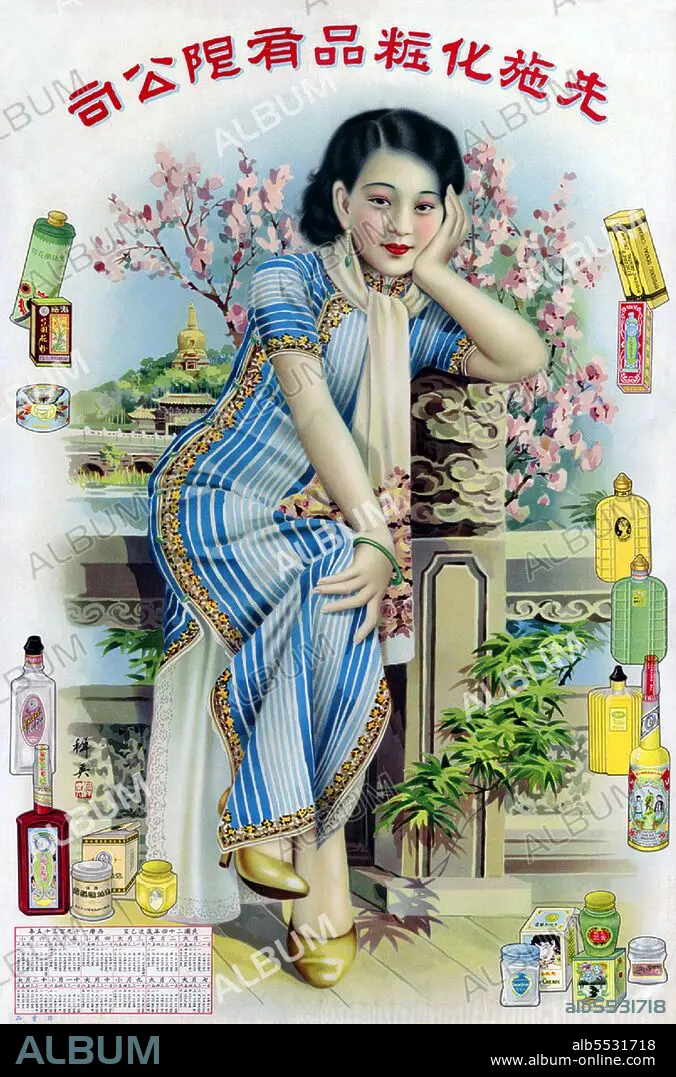 Title: China: Chinese advertising poster of the 1930s featuring a woman wearing a qipao or cheongsam.