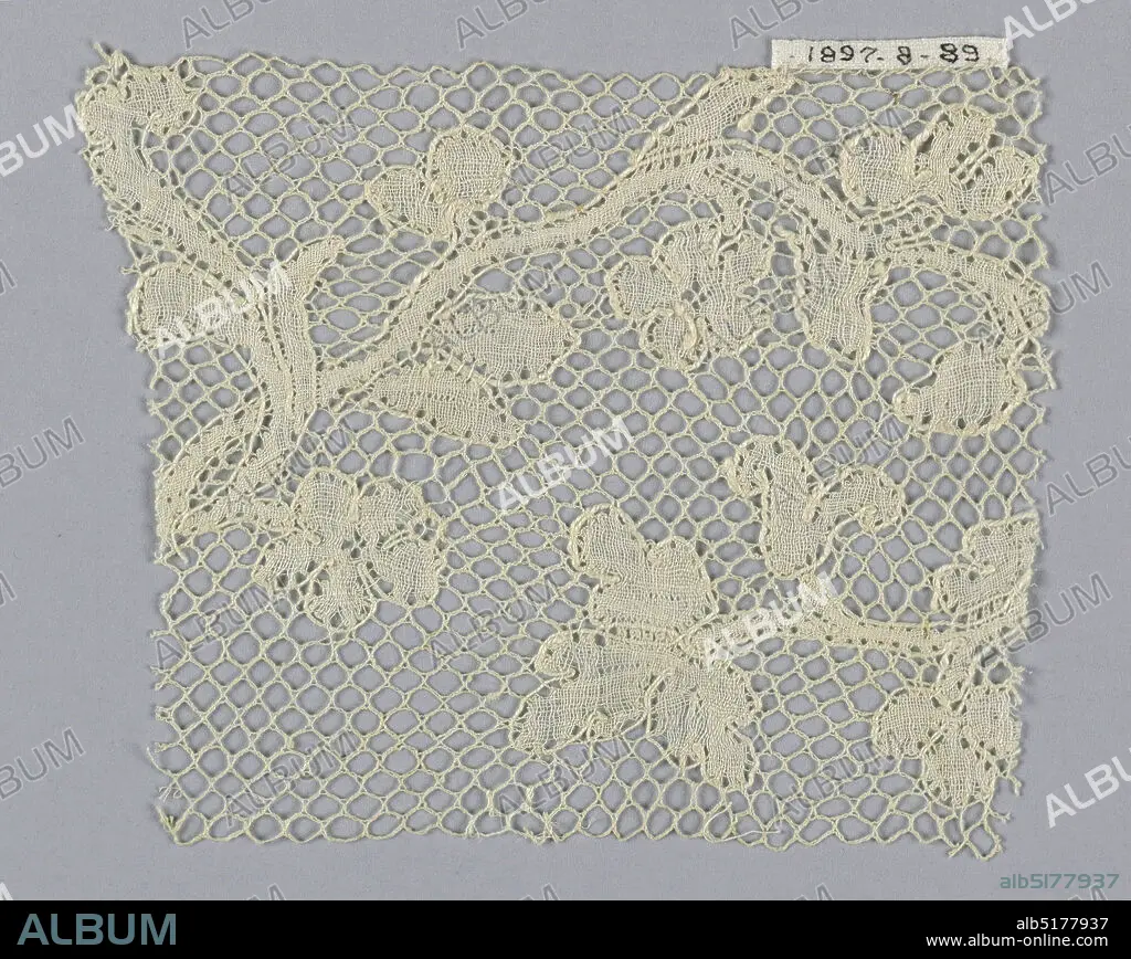 Caption: Fragment, Medium: linen Technique: bobbin lace (Lille-style with heavy outlining thread), Serpentine stem with leaves and flowers and Lille ground., Belgium, 18th century, lace, Fragment