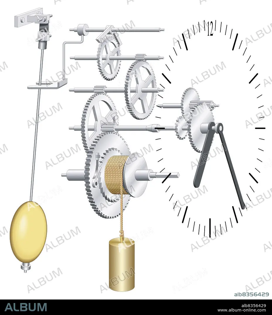 Caption: This clock is operated by weights that, under gravity, drive the hands of the clock in their rotational movement by means of a gear train.