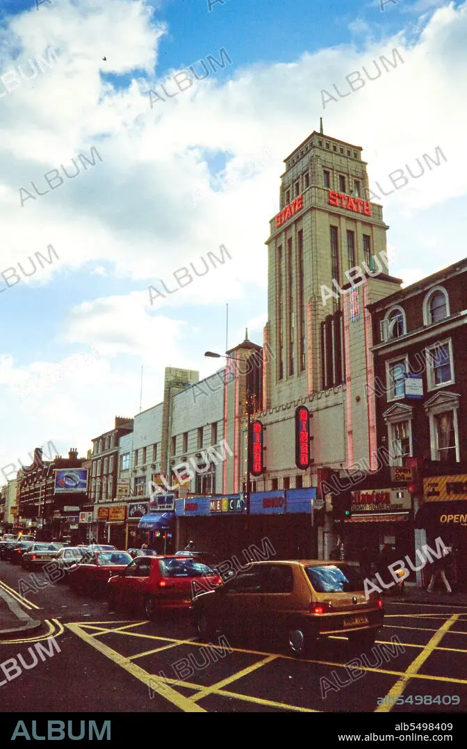 Mecca Bingo Club, Kilburn High Road, Kilburn, Brent, London, 1990-2004. The Mecca Bingo Club and Kilburn High Road viewed from the north. The Gaumont State Theatre was opened in 1937. It was one of the largest cinemas in Europe, and the largest in England, with a seating capacity of 4,004. The exterior design is reputedly inspired by the Empire State Building in New York. The building was later divided into a dance hall, cinema and bingo hall, before being used solely as a bingo hall from around 1990. In 2010 the building reopened as a church.