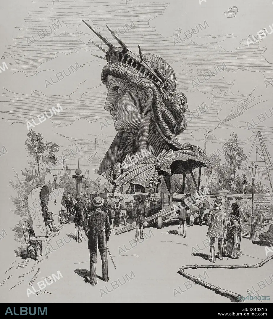 Caption: History of France. Paris. Universal Exhibition of 1878. It was held from May 1 to November 10, 1878. Head of the colossal statue "Liberty Illuminating the World" to serve as a lighthouse in New York Harbor, presented at the Champ de Mars. Drawing from life by Pellicer. Engraving by Capuz. La Ilustración Española y Americana, 1878.
