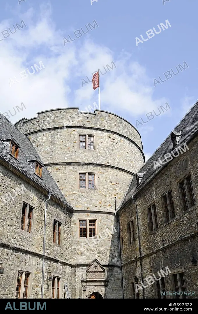 Caption: North Tower, Wewelsburg, triangular castle, former Nazi cult and terror center of the SS, today historical museum, hostel, Bueren, Paderborn, North Rhine-Westphalia, Germany, Europe