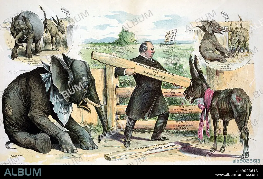 Title: President Cleveland adding boards labelled 'Extension of Civil Service Reform