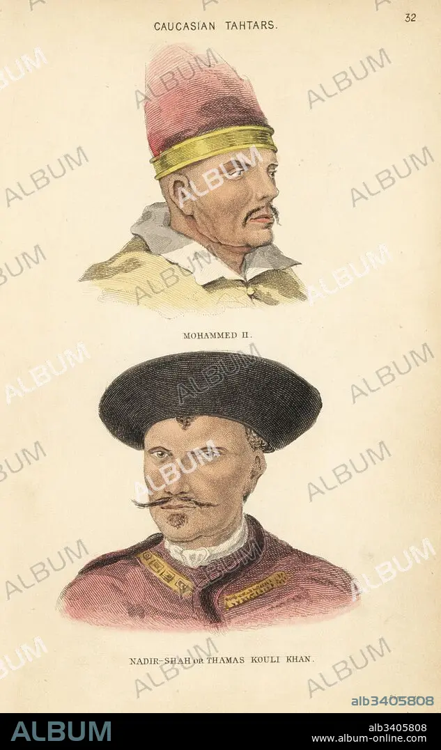 Portraits of Mohammed II or Mehmed the Conqueror, Ottoman sultan, showing the Turkish Ouralian character, and Nadir Shah, or Thamas Kouli Khan, or the Slave of Thamas, 18th century conqueror. Caucasian Tatars. Handcoloured steel engraving by Lizars after an illustration by Charles Hamilton Smith from his Natural History of the Human Species, Edinburgh, W. H. Lizars, 1848.