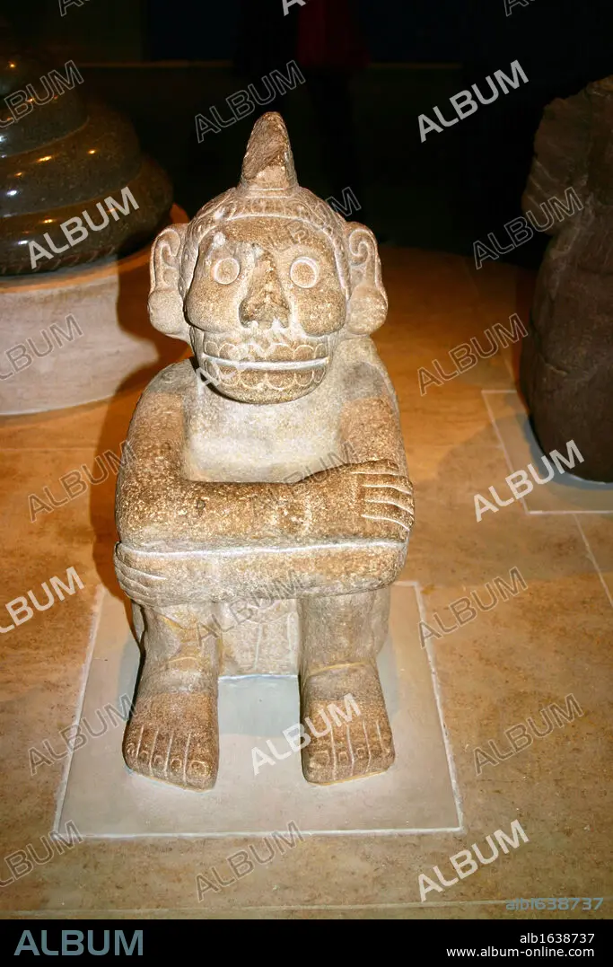 Caption: Seated sandstone figure of Mictlantecuhtli: Aztec, AD 1325-1521. Mexico. Mictlantecuhtli was an Aztec god associated with death. Pre-Columbian Mesoamerican Mythology. Sculpture