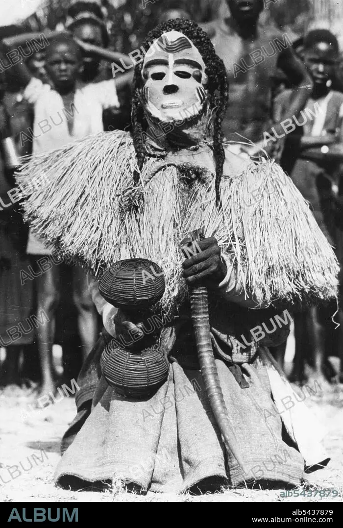 Caption: Congo Folklore -- One of the some twenty characters in the Mbuya dance of the Bapende tribe... An African Folklore 'play'. He wears a white-painted mask, Pigtails, and carries a basket filled with dried seeds and an Antelope horn. The Folklore of Africa lies, not in books, but in the Rhythmic Tribal dances that are handed down from generation to generation. the origins of the dance steps, the gestures and the sometimes fearful looking costumes are deep in the past, and deal with drought and rain