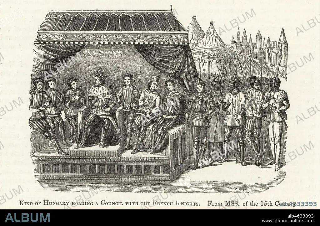 Caption: King Sigismund of Hungary in council with his own lords and French lords before crossing the Danube to invade Turkey, 1396. King of Hungary holding a council with the French knights. Woodcut after an illuminated manuscript from Sir John Froissart's Chronicles of England, France, Spain and the Adjoining Countries, from the Latter Part of the Reign of Edward II to the Coronation of Henry IV, George Routledge, London, 1868.