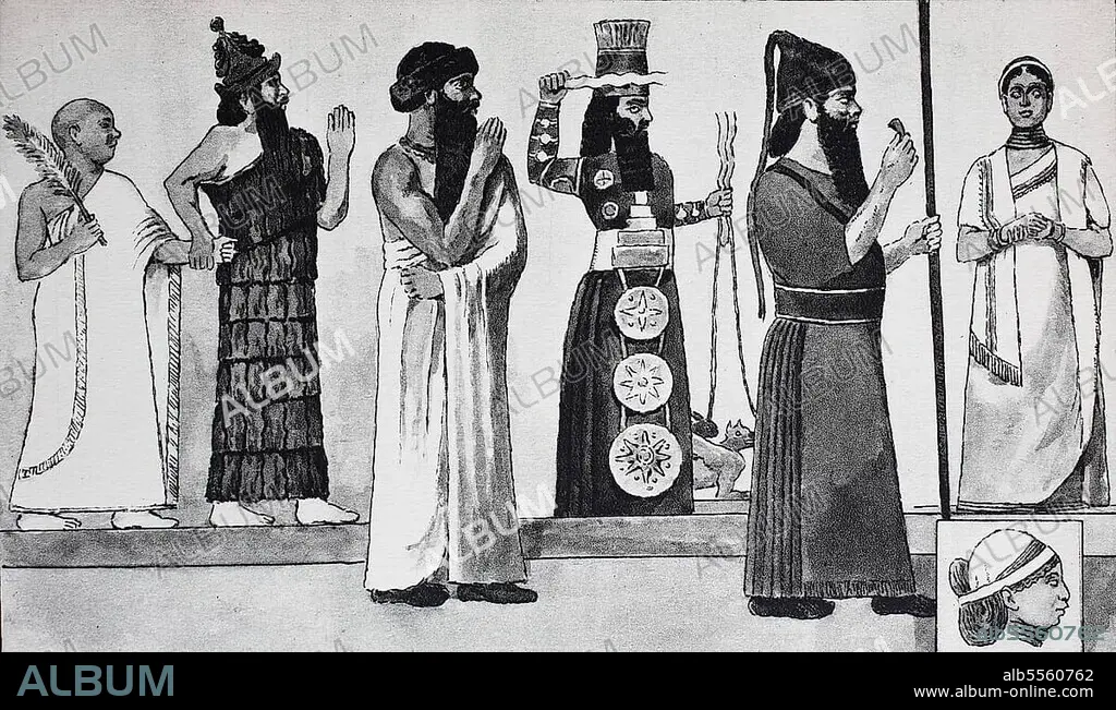 Caption: Kleidermode in Babylon und Assyrien, von links, altbabylonischer Priesterkönig Gudea um 2250 v. Chr. im gewebten weißen Mantel wird von einem Gott geführt, dieser im Pelzmantel, dann König Hamurabi, um 2200 v. im sumerischen Mantel und karmesinroter Pelzmütze, dann ein Götzenbild des babylonisch-assyrischen Wettergottes Adad, dann König Merodach-Baladan von Babylon, 722-710 v. dann eine edle babylonische Frau, digital verbesserte Reproduktion einer Illustration aus dem 19. Jahrhundert