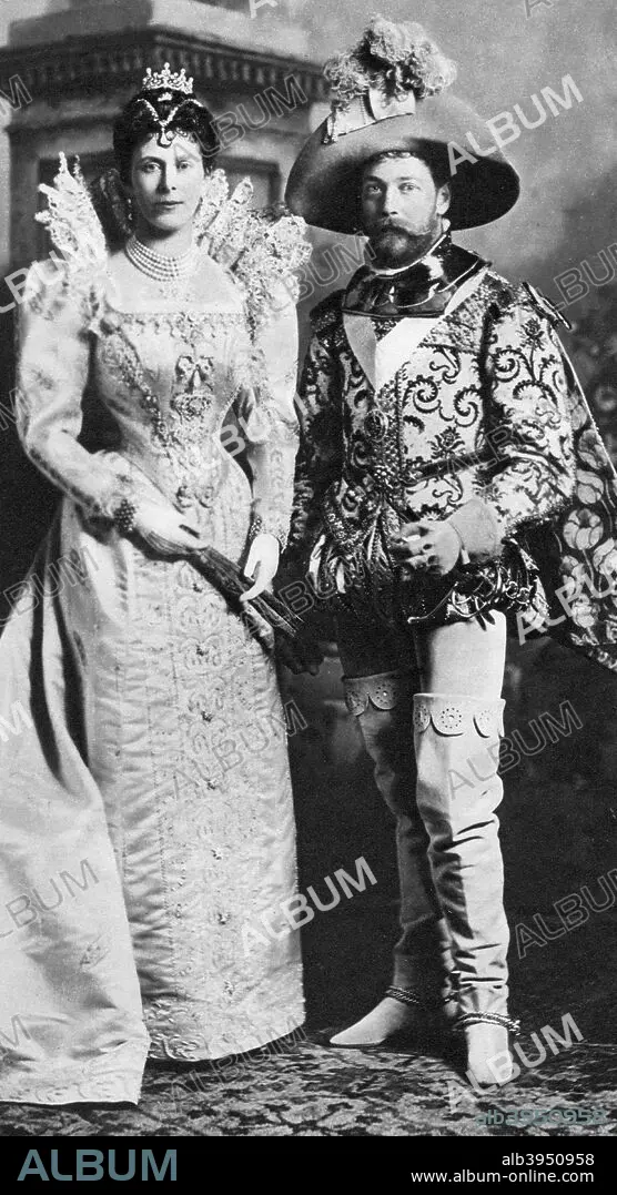 Caption: Prince George and Mary of Teck in fancy dress, Devonshire House Ball, 1897. The future King George V with his wife in Elizabethan costume. Illustration from George V and Edward VIII, A Royal Souvenir, by FGH Salusbury, a souvenir book published as Edward VIII was crowned following the death of his father, George V, (Daily Express Publication, London, 1936).