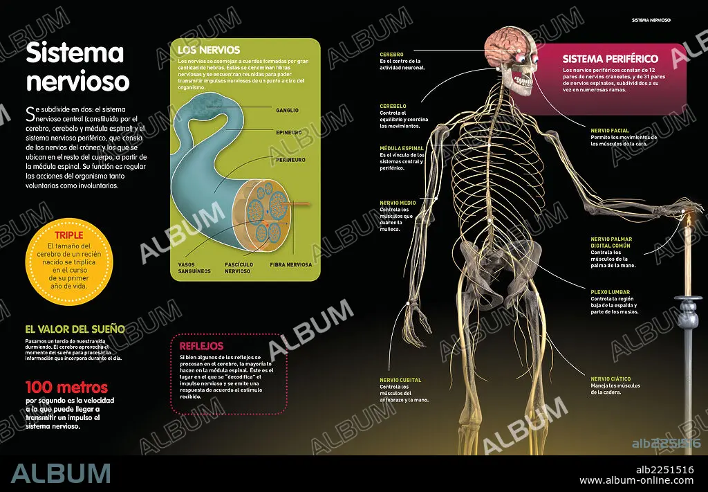 Caption: Infographic that describe the nervous central and peripheral systems, in charge of communicating the organs of the senses with the brain, and the internal structure of a nerve.