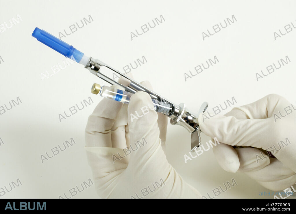 A novocaine carpule is inserted into a anaesthetic syringe by a dentist. A carpule is a type of ampule or cartridge containing liquid medication.