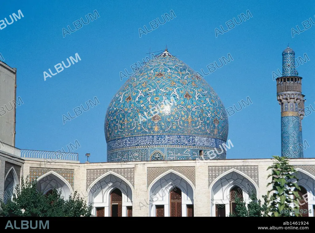 Caption: Madrasah-i Madar-i Shahh, also known as Chahar Bagh school. It was built under the patronage of Shah Husain I, a Safavid king. 18th century. Dome and minarets. Isfahan. Iran.