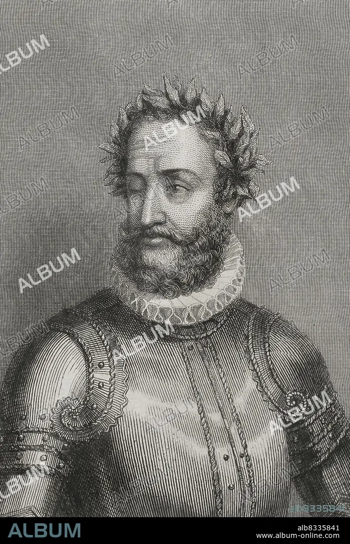 CHARLES GEOFFROY (1819-1882). FRENCH ENGRAVER.. Luis Vaz de Camoes (1524-1580). Portuguese writer and poet. Author of "Os Lusiadas" (1572). Portrait. Engraving by Geoffroy. "Historia Universal", by César Cantú. Volume V. 1856.