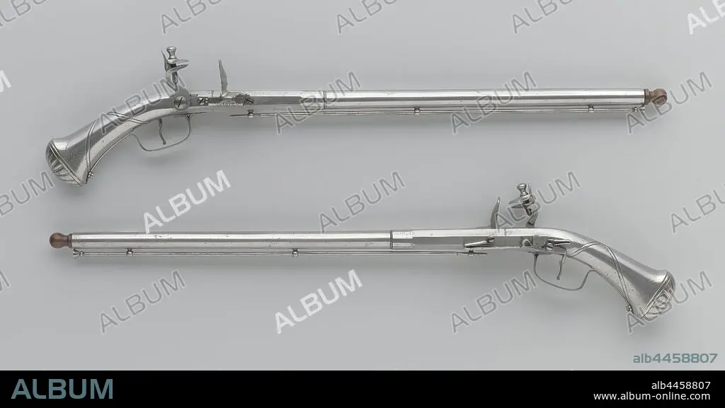 Caption: Flint gun with iron butt, All-iron flint gun, part of a couple. The lock mechanism is located entirely on the outside, the pan and the spring are hidden behind a casing engraved with a blossom branch. The three upper surfaces of the barrel are engraved on the back with tulips. The flask consists only of an iron grip that forms an extension of the barrel, the grip is deeply incised with two pairs of oblique lines that intersect, and at the bottom with two blossom branches, the butt knob is decorated with a pattern of radiating ribs. The iron fitting consists of three eyelets soldered to the barrel in the form of knobs as loading rod tubes, and a flat trigger guard engraved with a rose, the loading stick is made of steel., anonymous, 1645 - 1650, iron (metal), steel (alloy), soldering, l 60.4 cm l 53 cm d 14.1 mm w 1057 gr