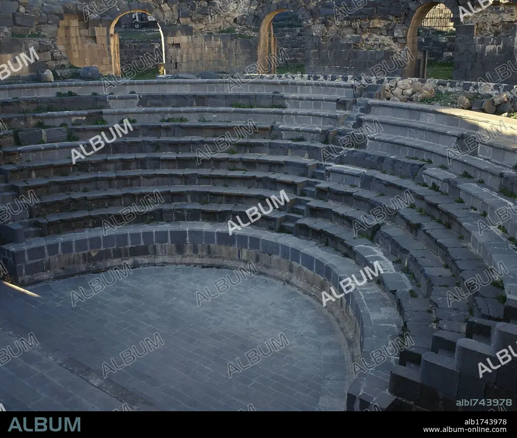 Caption: Syria, Shahba (known in Late Antiquity as Philippopolis). View of the theatre faced with basalt blocks. 3rd century. Photo taken before the Syrian civil war.