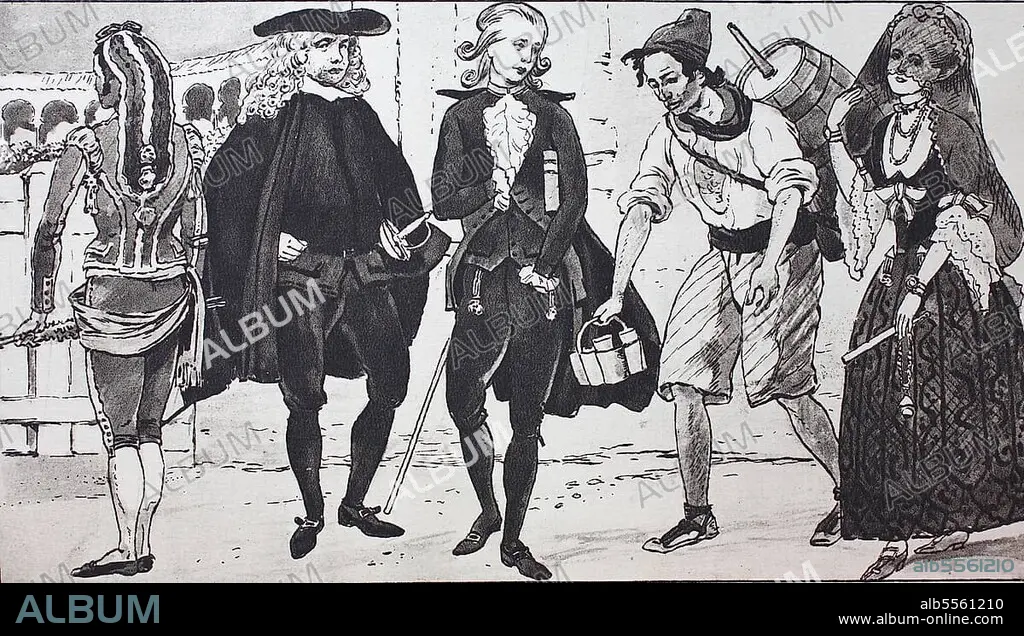 Caption: Mode, Kostüme, Kleidung in Spanien, 18. -19. Jahrhundert, von links, ein Bandillero, dann ein Alguacil, ein Richter, dann ein Abbé, dann ein Wasserverkäufer und ein Kleinbürger, digital restaurierte Reproduktion einer Originalvorlage aus dem 19. Jahrhundert