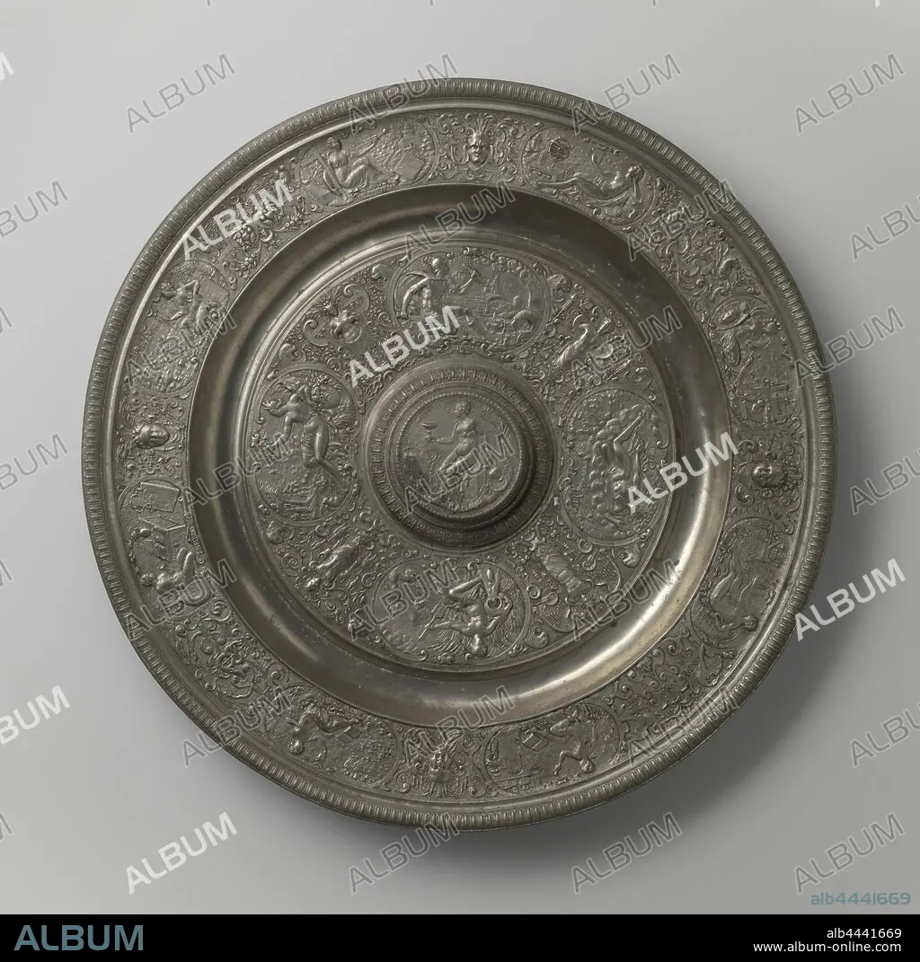 Caption: Temperantia dish made of tin, Temperatia dish made of tin. The shelf has an elevation in the middle with a representation of temperance. On the lower part of the shelf, the four elements are depicted in ovals, separated by hermes in rolling gear. Clockwise: fire, air, water and earth. The rise from flat to edge is decorated. The border is decorated with ovals, separated by grotesques in scroll work, the seven liberal arts and Minerva. Clockwise: Astrologia, Minerva, Grammar, Dialectica, Rhetorica, Musica, Arithmetica and Geometria. A medallion portrait of François Briot has been applied in the middle on the underside., François Briot, France, 1585 - 1590, tin (metal), h 3.8 cm × d 45 cm