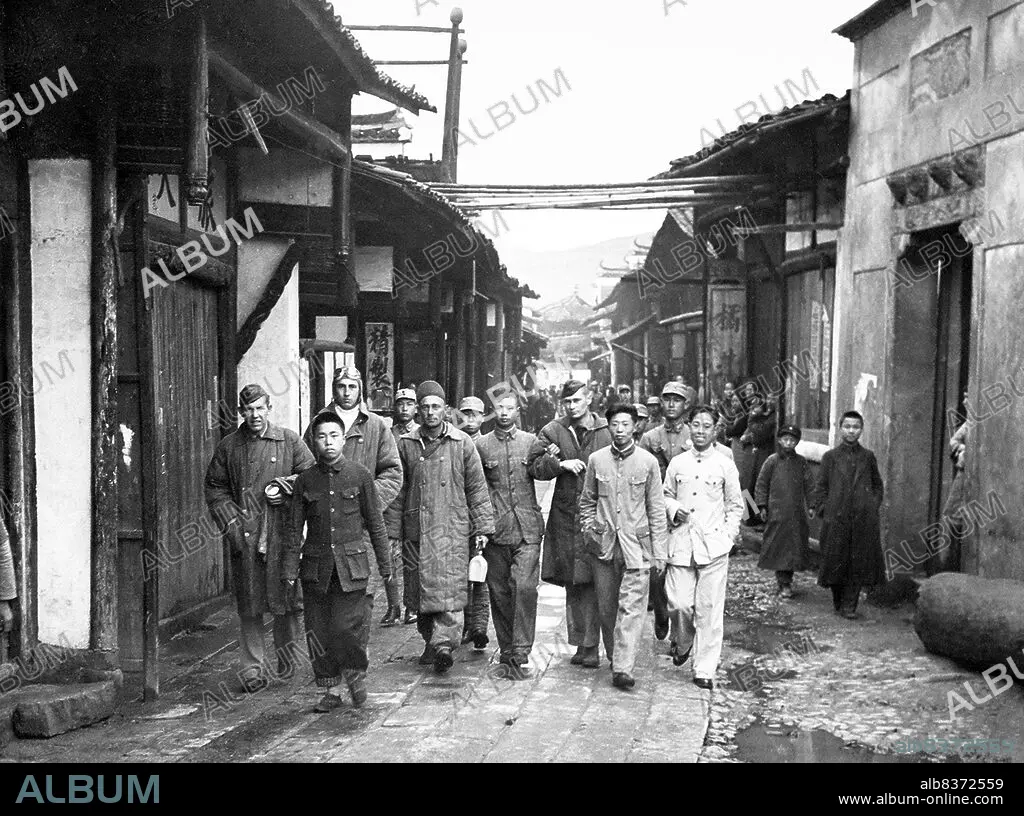 Title: USA / Japan / China: Four unidentified Doolittle Raid crewmen, who bailed out over China from Aircraft no. 14, are escorted through a Chinese town before being reunited with other airmen, April 1942