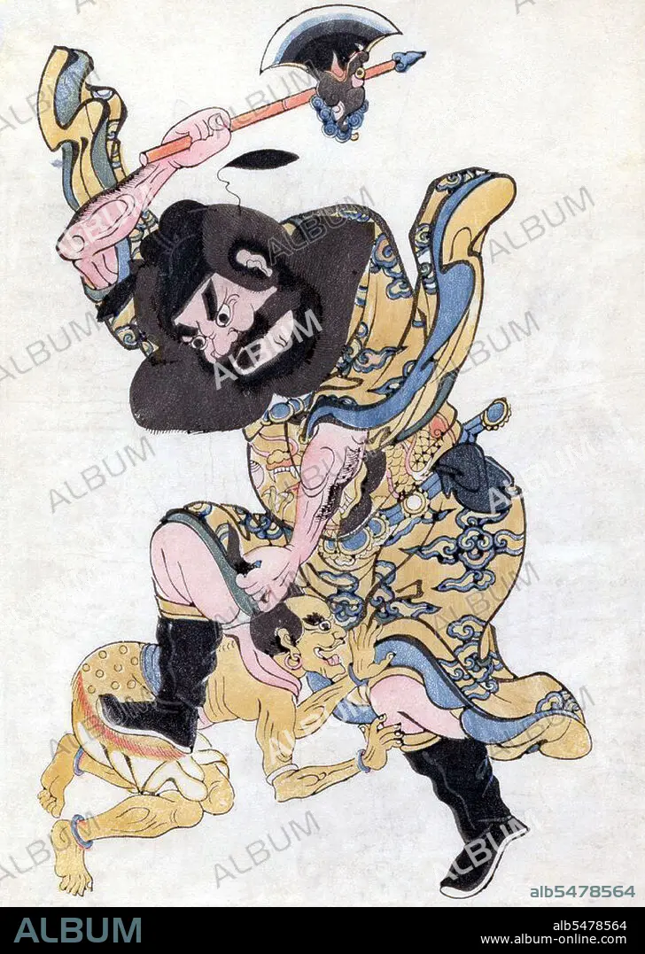 Title: China: Zhong Kui assaulting a demon with an axe,17th century coloured woodblock print.