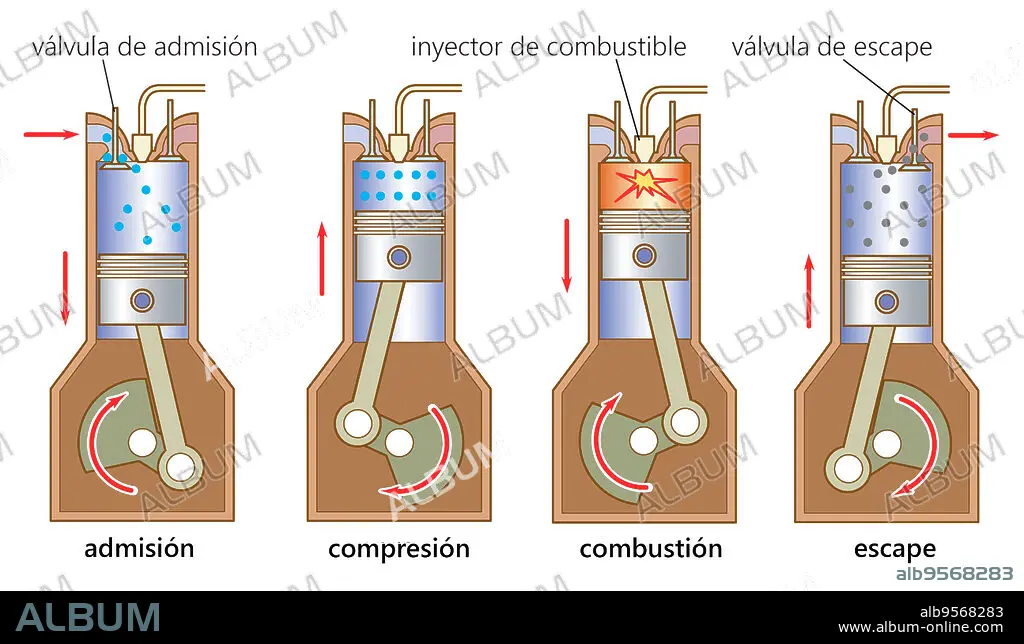 Caption: The sequence of events in a four-stroke diesel engine involves a single intake valve, fuel-injection nozzle, and exhaust valve.