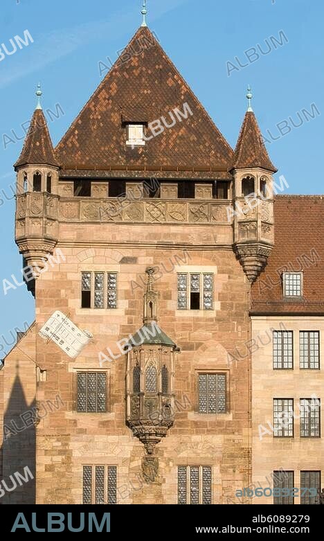 Deutschland, Bayern, Franken, Nürnberg, Lorenzer Altstadt, Turm vom Nassauer Haus; Das Nassauer Haus oder Schlüsselfeldersches Stiftungshaus ist ein mittelalterlicher Wohnturm aus sogenanntem roten Burgsandstein. Es handelt sich dabei um den letzten noch existierenden, ursprünglich in romanischem Stil erbauten, Wohnturm