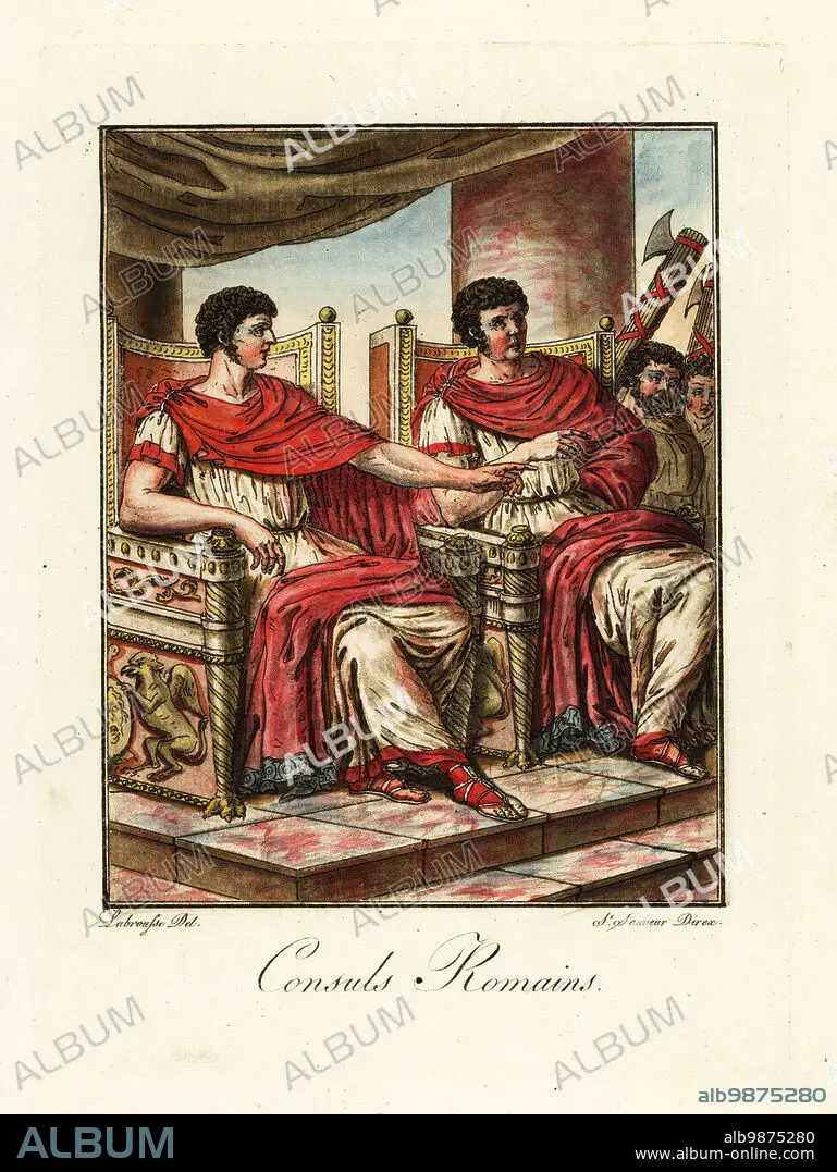 Caption: Two Roman consuls seated on thrones in ancient Rome. They wear purple-bordered toga praetexta and are attended by lictors with fasces. Consuls Romains. Handcoloured copperplate drawn and engraved by L. Labrousse, artist of Bordeaux, under the direction of Jacques Grasset de Saint-Sauveur from his Lantique Rome, ou description historique et pittoresque, Ancient Rome, or historical and picturesque description, Chez Deroy, Paris, 1796.