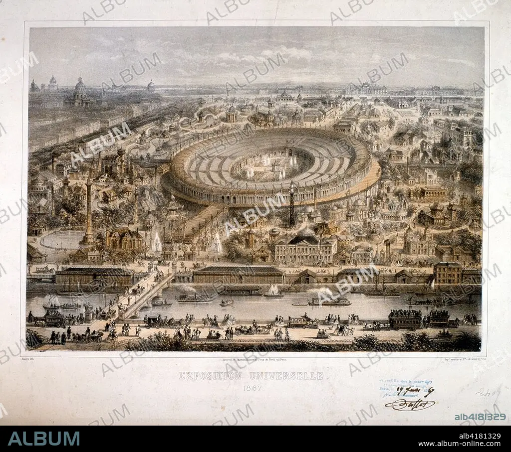Caption: Illustration depicting the International Exposition of 1867 (Exposition Universelle d'art et l'Industrie), was the second world's fair to be held in Paris, from 1 April to 3 November 1867. Forty two nations were represented at the fair. Following a decree of Emperor Napoleon III, the exposition was prepared as early as 1864, in the midst of the renovation of Paris, marking the culmination of the Second French Empire.