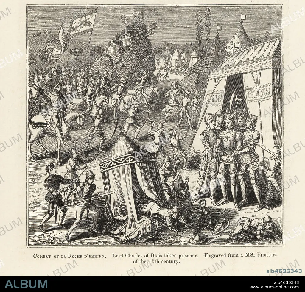 Charles de Blois, Duke of Brittany, is captured in the Battle of La Roche-Derrien, 1347. Combat of La Roche-d'Errien, where Lord Charles of Blois was taken prisoner. Woodcut after an illuminated manuscript from Sir John Froissart's Chronicles of England, France, Spain and the Adjoining Countries, from the Latter Part of the Reign of Edward II to the Coronation of Henry IV, George Routledge, London, 1868.