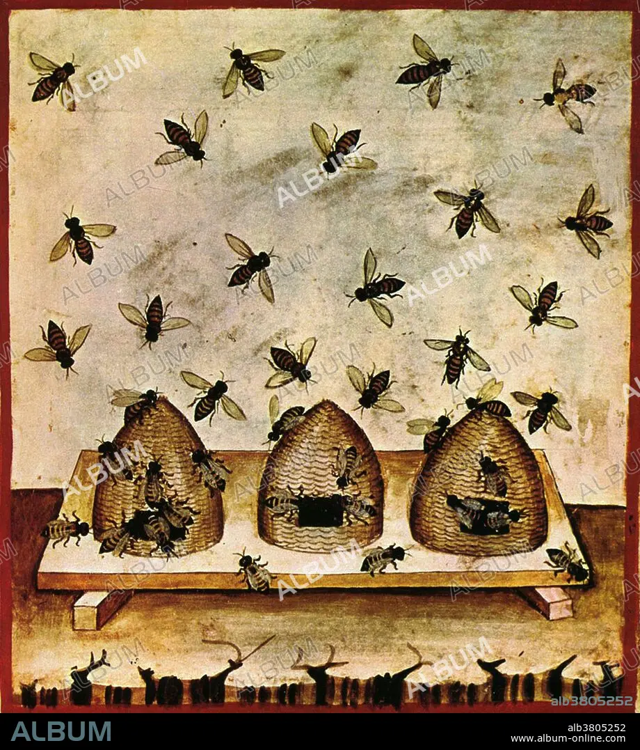 Caption: Beekeeping is the maintenance of honey bee colonies, commonly in hives, by humans. A beekeeper (or apiarist) keeps bees in order to collect honey and other products of the hive (including beeswax, propolis, pollen, and royal jelly), to pollinate crops, or to produce bees for sale to other beekeepers. A location where bees are kept is called an apiary or "bee yard". The Tacuinum (sometimes Taccuinum) Sanitatis is a medieval handbook on health and wellbeing, based on the Taqwim al-sihha, an 11th century Arab medical treatise by Ibn Butlan of Baghdad.