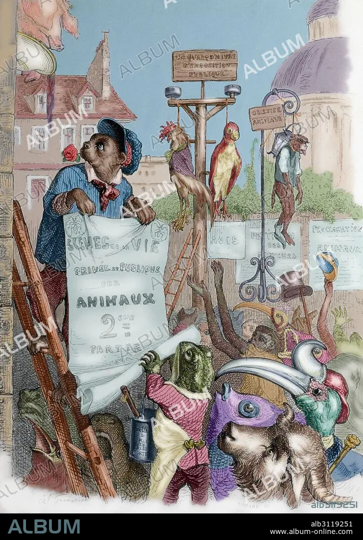 Caption: J.J. Grandville (pseudonym of Jean Ignace Isidore Gerard) (1803-1847). French caricaturist. The private and public life of animals. Satire of French society of 1840 through the eyes of animals. Satiric lithography. Paris, edited by J. Hetzel, 1842. Colored.