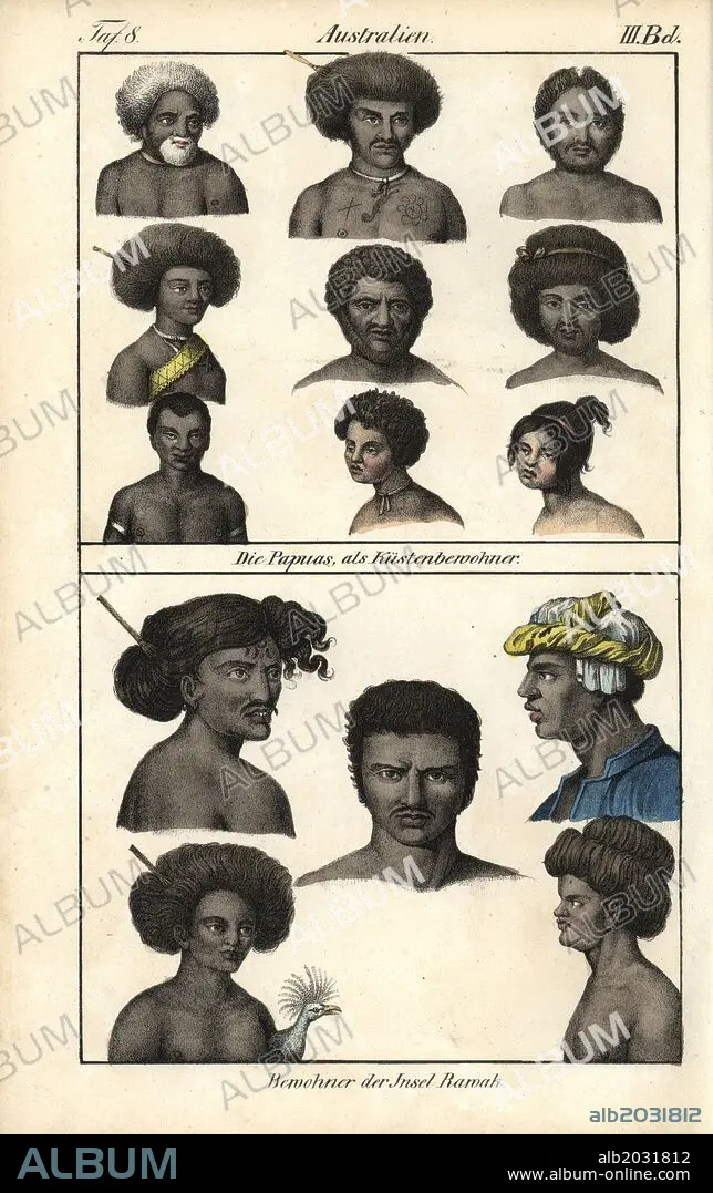 Caption: Natives of the island of Papua (New Guinea): coastal dwellers with hair combs and body scarification at top, and natives of Rawak island off Waigeo. Handcoloured lithograph from Friedrich Wilhelm Goedsche's "Vollstaendige Völkergallerie in getreuen Abbildungen" (Complete Gallery of Peoples in True Pictures), Meissen, circa 1835-1840. Goedsche (1785-1863) was a German writer, bookseller and publisher in Meissen.