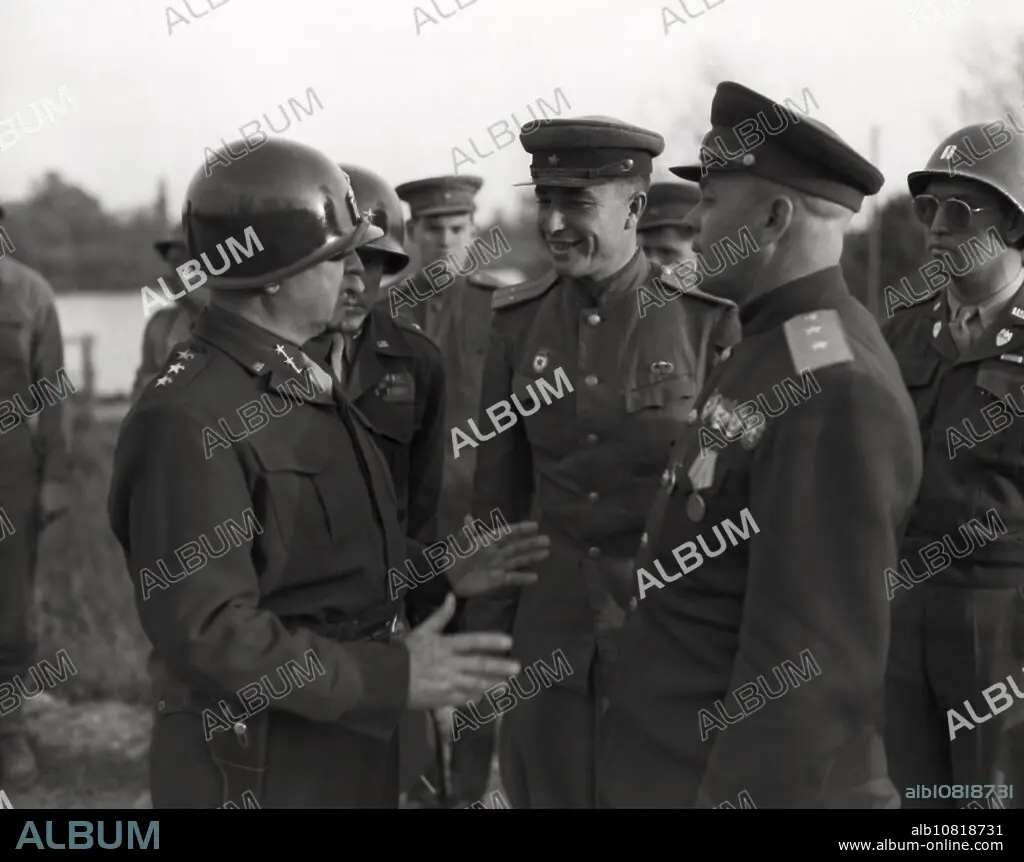 Caption: Enns, Austria, May 9, 1945 Lt. Gen. Walton H. Walker CG of the XXth Corps, U.S. Third Army, and his staff, meet up with Lt-General Birukoff, CG, XXth Carde Corps, 4th Russian Army, and his staff, at the Enns River.
