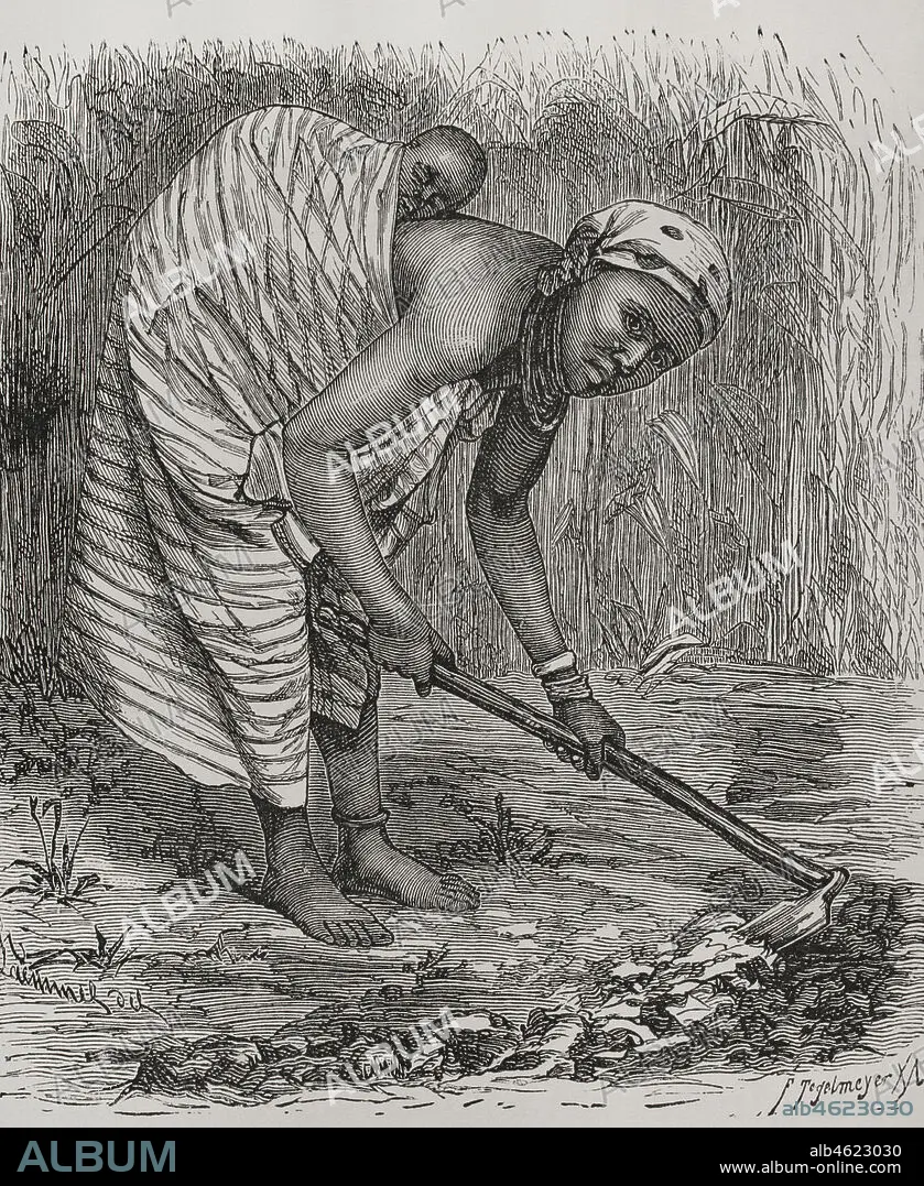 Automatic translation: History of Africa. XIX century. Slave woman working carrying her son tied to her back. Engraving by F. Tegelmeyer. The Congo and the Creation of the Independent State of this name. History of Verified Works and Explorations, by Enrique M. Stanley. Published in Barcelona, around 1890. Spain